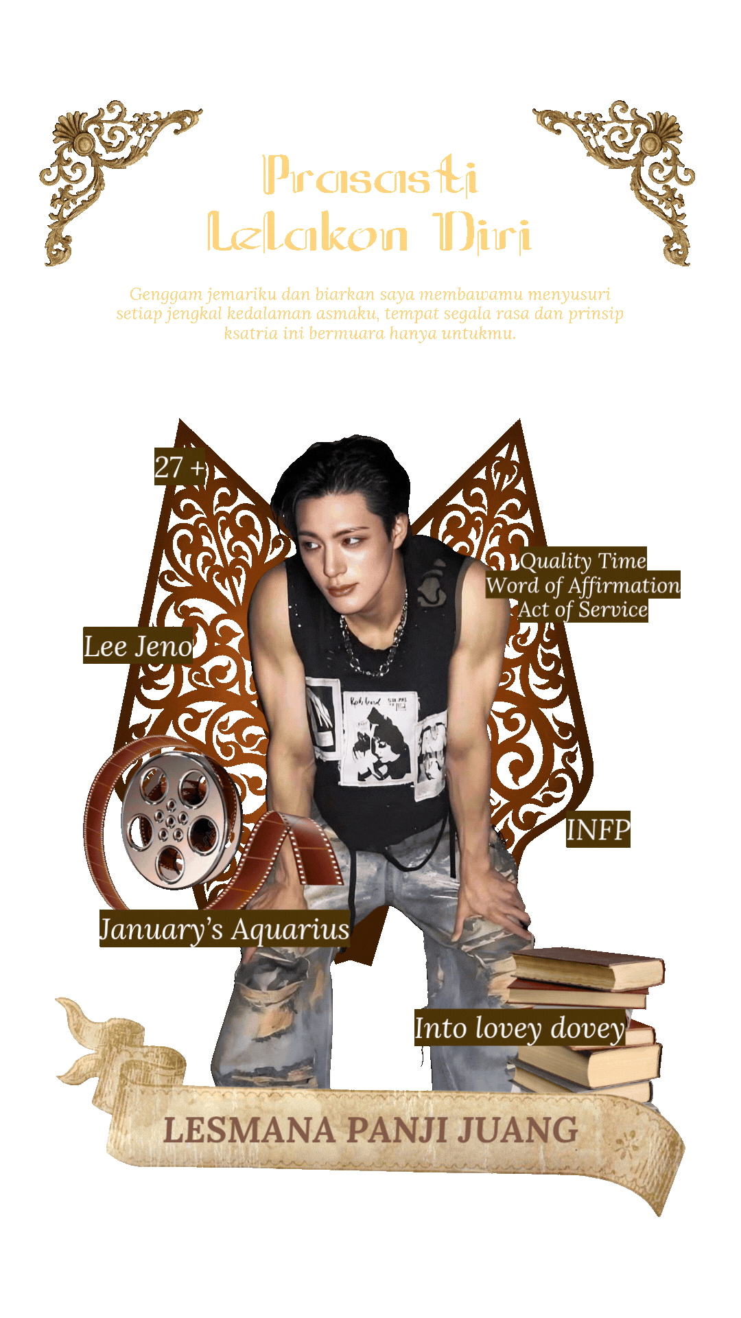Inilah hikayat seorang lelaki yang hidupnya tak hanya demi meraih nama, namun juga untuk memahami makna-makna yang disembunyikan dunia. Saya adalah seorang pemelajar abadi yang selalu terpikat pada kedalaman ilmu dan rahasia semesta. Bagi saya, kedewasaan bukan hanya soal bertambahnya usia, melainkan kematangan nalar dan ketangguhan mental yang ditempa oleh pengalaman. Saya tumbuh dengan prinsip untuk selalu mendewasa, menjadi sosok yang ngemong dan merengkuhmu dengan ketenangan, memberikan rasa nyaman yang lahir dari jiwa yang sudah selesai dengan ego dirinya sendiri.Kini, seluruh pengabdian saya kuserahkan sepenuhnya untukmu, pemilik tunggal pelengkap sukma saya. Layaknya ksatria yang teguh memahat janji, daksa saya adalah benteng karang yang siap pasang badan demi melindungimu, sang haur pemikat jiwa. Namaku abadi dalam aksara, Lesmana Panji Juang.ㅤHadirku lir bayu selebu, tenang melanting kasih di rengkuhan hangatnya, setiap tutur rayu yang dirapalkan olehku, Setiap tutur rayu yang saya rapalkan bukan sekadar rangkaian kata, melainkan candu yang melilit sukma; ia adalah penawar lara yang paling mujarab sekaligus pemantik bara yang sanggup menghanguskan keraguanmu. Lihatlah lebih dalam netra saya, di sana kamu akan temukan keguyuban yang lebih indah dari seribu fajar, membangkitkan kembali gelora asmara yang sempat mati suri. Biarkan yang mati rasa kembali mengecap nikmatnya cinta, sebab atma saya telah tersemat begitu dalam, mengalirkan hangat yang sanggup melelehkan dinginnya kalbumu. Siapa pun yang berani masuk ke dalam asmaraloka bersama saya, niscaya ia akan mabuk dalam kegembiraan yang tak berkesudahan, tenggelam dalam desah hasrat yang saya bisikkan tepat di telingamu, hingga kamu lupa bagaimana caranya untuk kembali pulang.