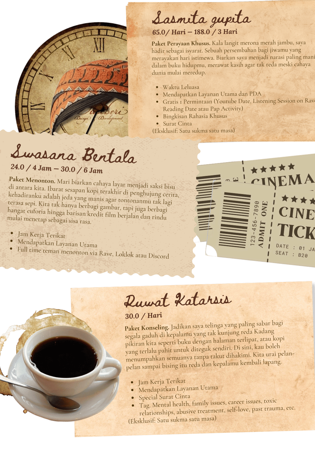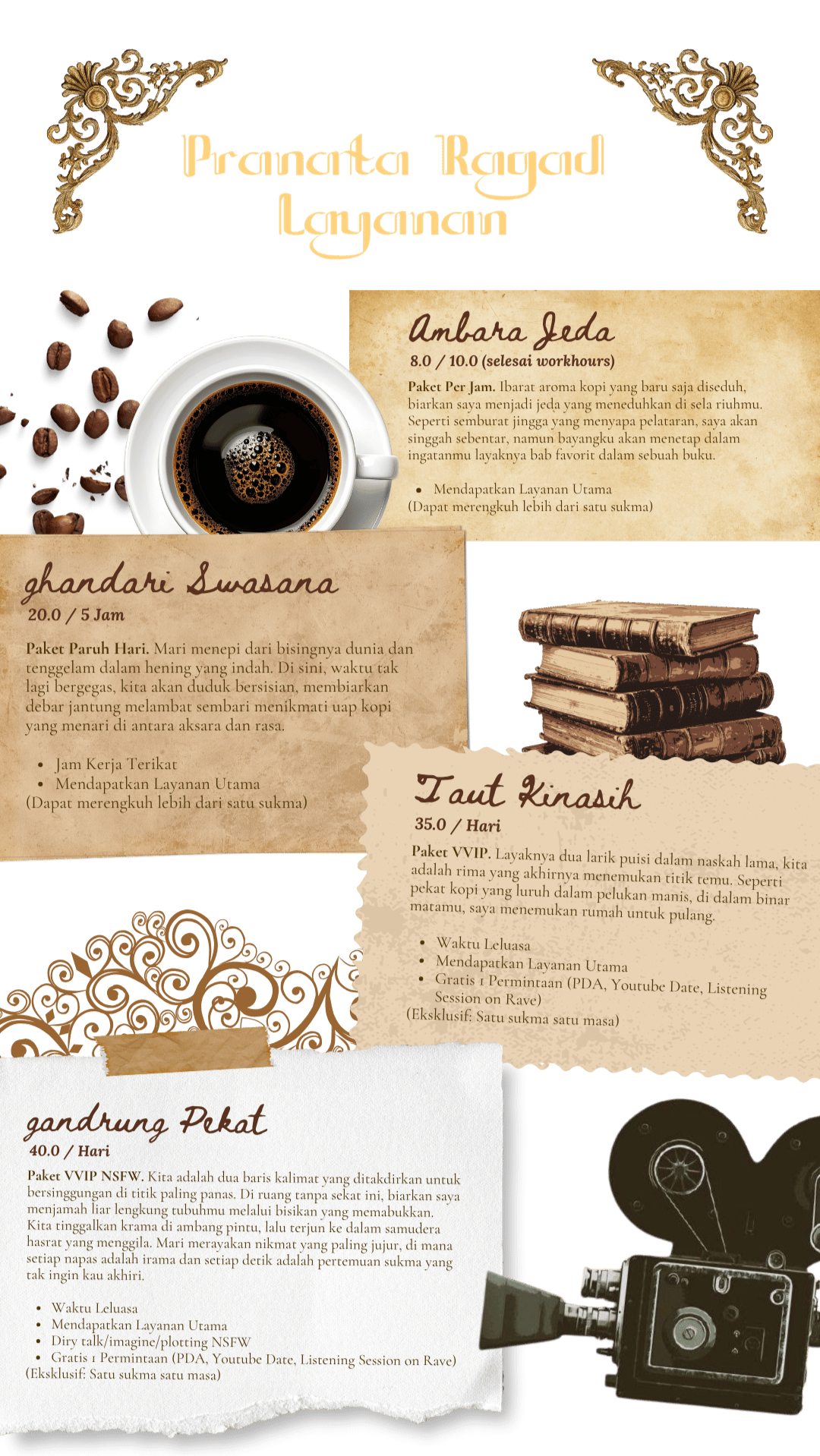 | Stay Up Late | 5.0 / Jam | Untuk layanan per jam, paruh hari, menonton, serta konseling. |